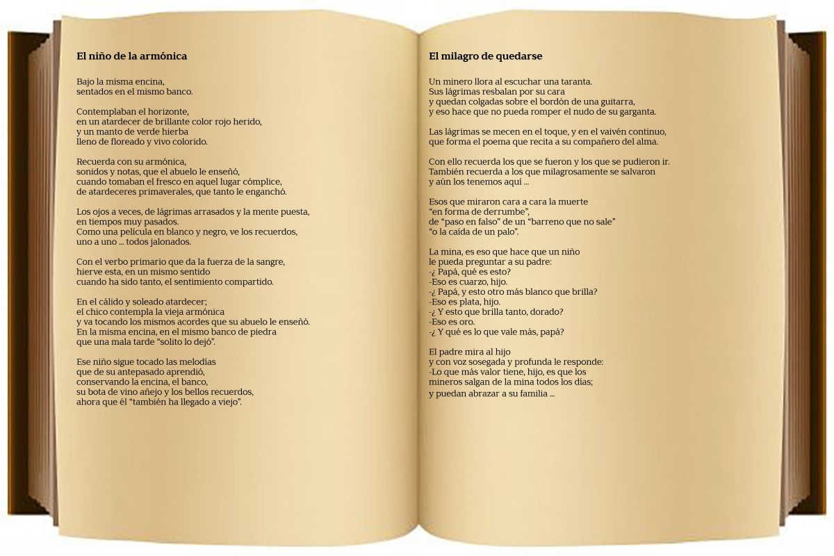 Es un poemario basado en las raíces mineras del propio autor, que no pretende ser monográfico. Más bien, todo lo contrario, pretende ser antológico y diverso, aun así, recoge las penurias y miserias que sufrió su tierra, los mineros y sus familias después de una Guerra Civil cruenta y un trabajo tan penoso y mal pagado.
