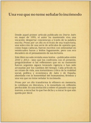 Desde aquel primer artículo publicado en Diario Jaén en mayo de 1995, el autor ha mantenido viva una vocación: despertar conciencias a través de la palabra escrita. Prosa por un día es el fruto de esa trayectoria, una selección de una serie de artículos de opinión que, como hojas caducas, fueron escritos con intensidad en veinticuatro horas y leídos fugazmente, pero con eco duradero en el pensamiento de sus lectores. Este libro no solo revisita esos textos —publicados entre 2010 y 2012— sino que los confronta con el presente…
